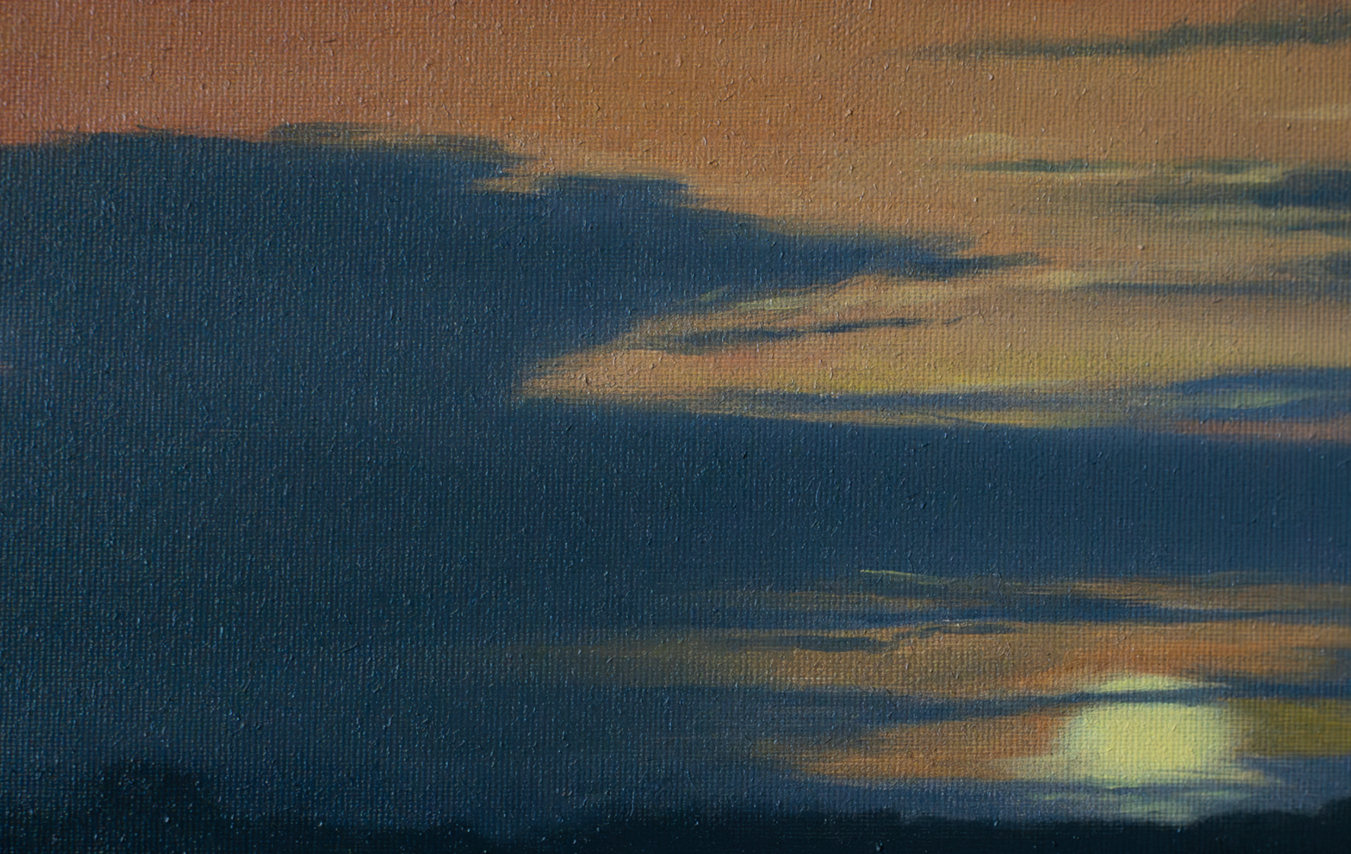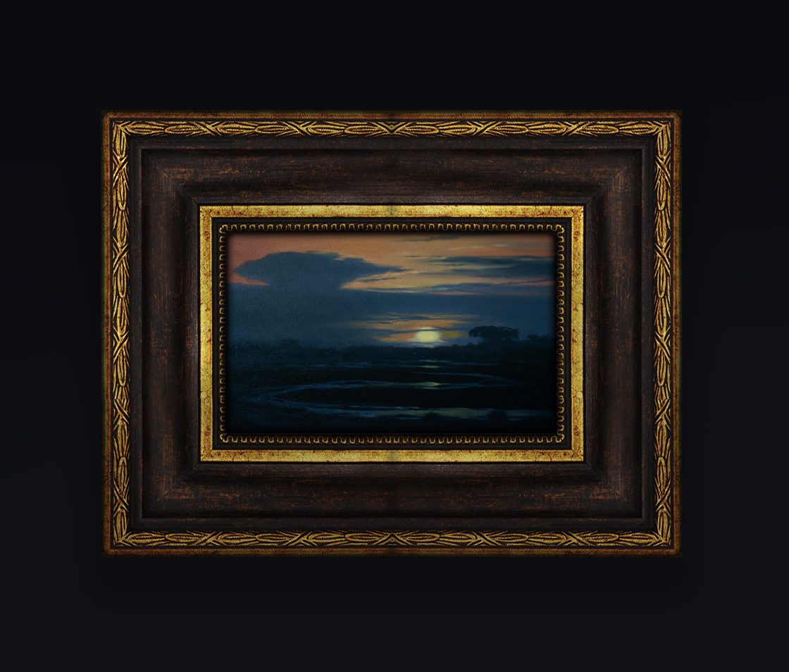 (oil on canvas, 15x25cm, synthetic frame) - 350€. Sunsets in Amazonia are always hazy. The great river, the forest itself saturate the air with water and smudge the vibrant colours in such a beautiful and amazing way that the real world almost looks like a painting.