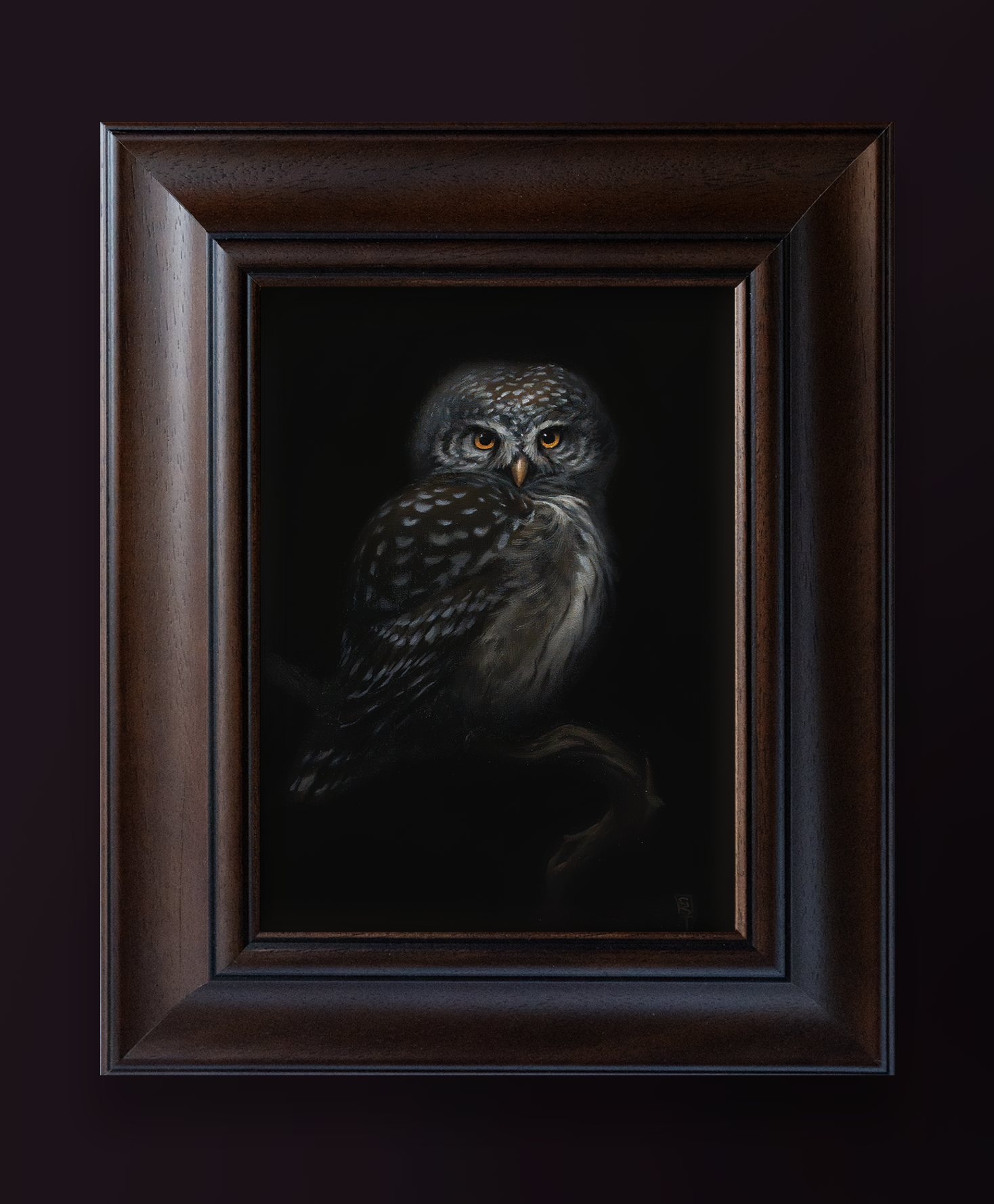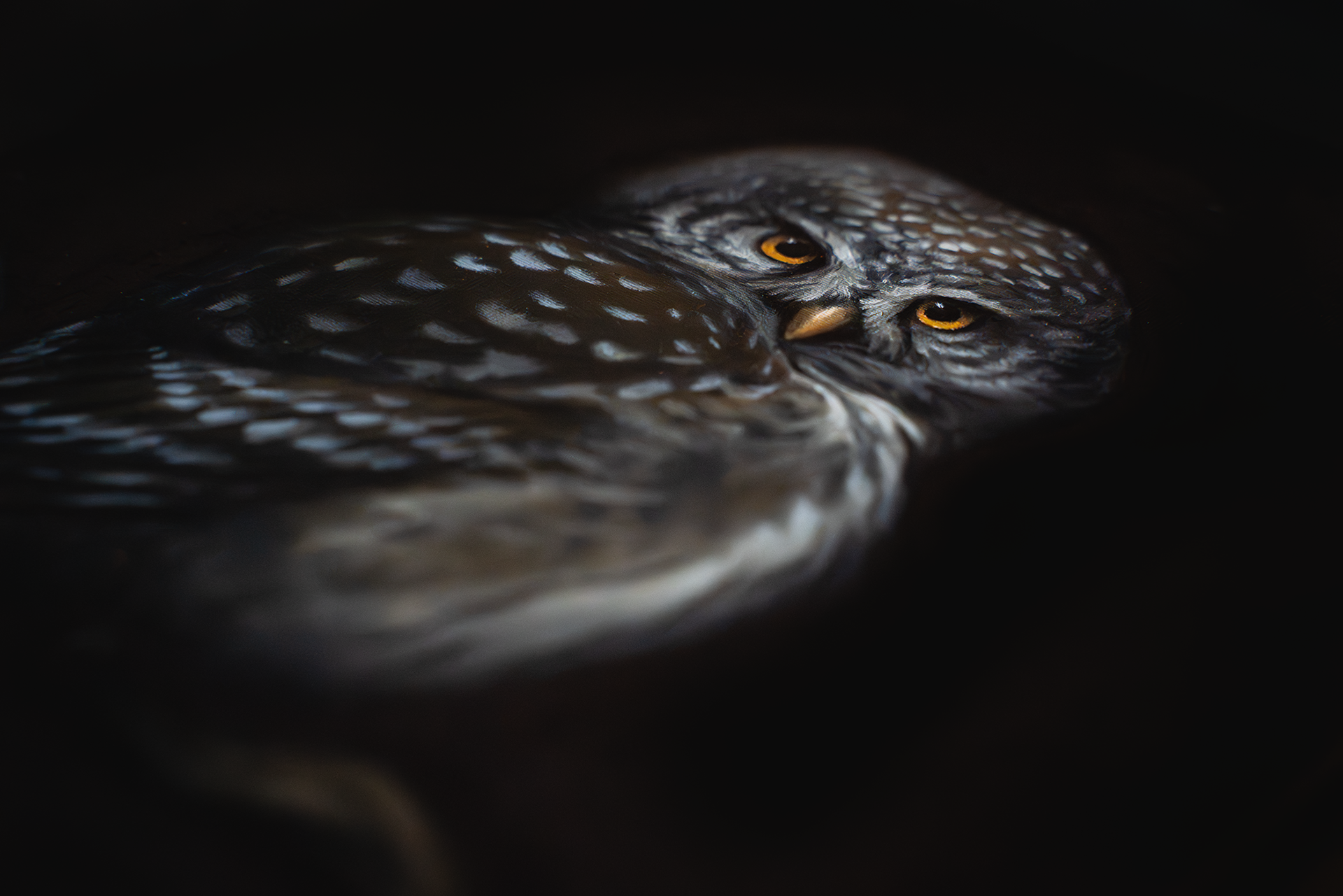 (oil on canvas, 18x24cm, wooden frame) SOLD - The Eurasian pygmy owl (Glaucidium passerinum) may be small, but it is also a fierce little predator of boreal forests. Barely larger than a thrush, it hunts by day as well as dusk, flashing bright yellow eyes and white speckles through the dark firs. Each time I saw it in the wild, I was bewitched by its intense, charismatic presence, unafraid of humans and rather curious.