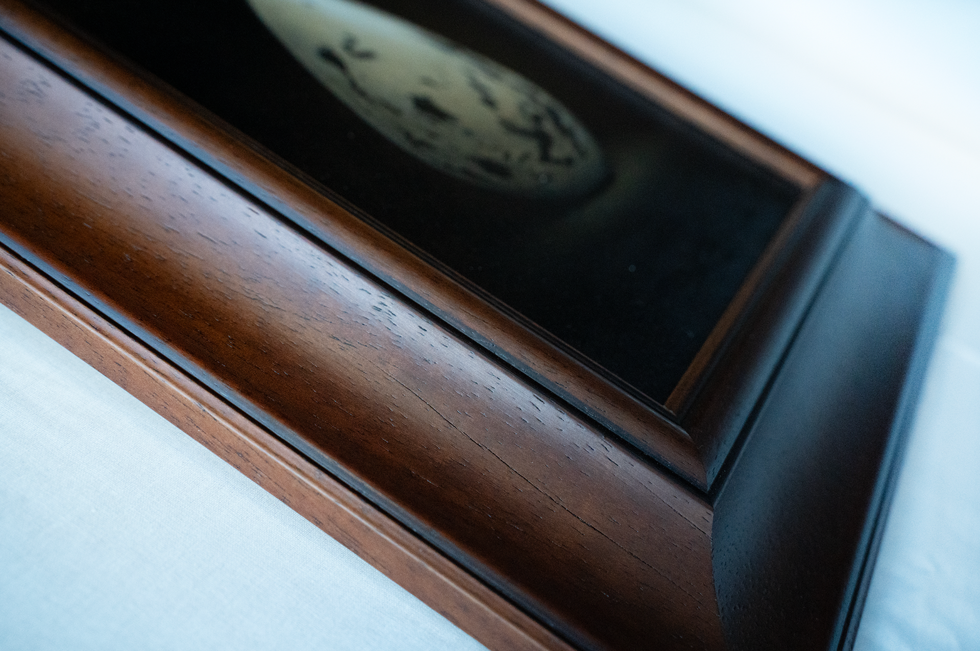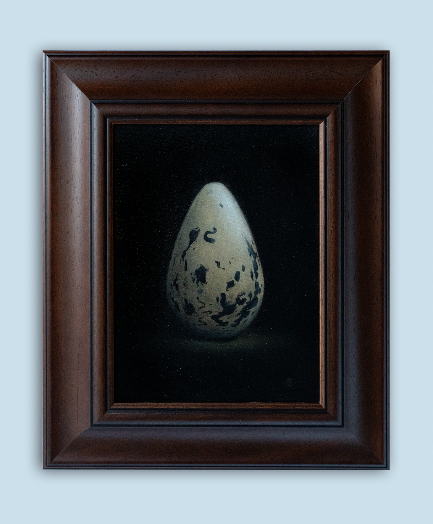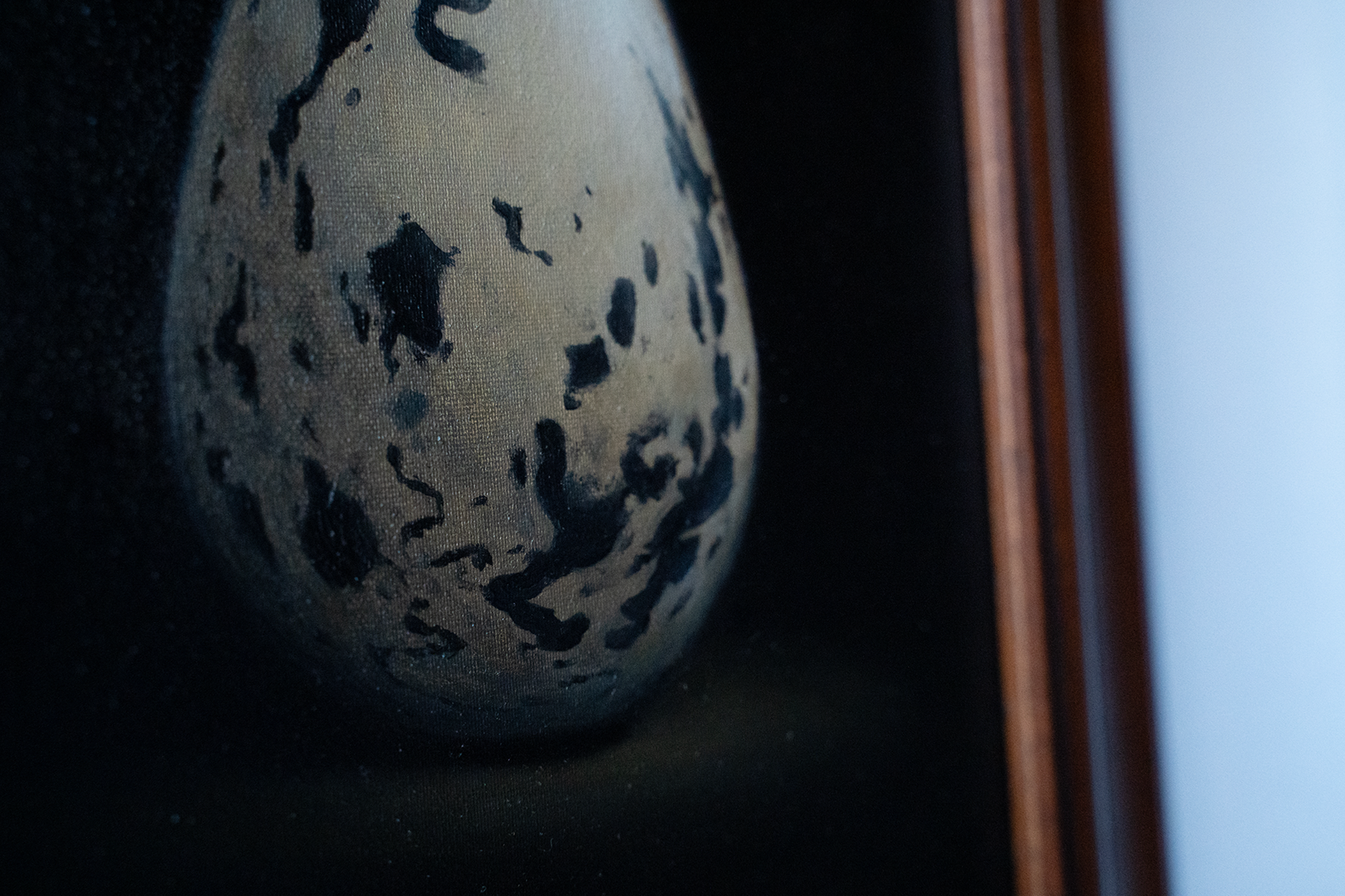 (oil on canvas, 18x24cm, wooden frame) - As humans arrived with boats and hunger, the great auk’s (Pinguinus impennis) fearlessness became fatal. It was taken for meat, for oil, for feathers to fill pillows, and finally for curiosity: its eggs collected, its body stuffed and displayed under glass. By 1844, the last known pair was killed on a small Icelandic island, ending a lineage that had endured for ages. Today, the great auk survives only in these pointy, uniquely speckled eggs, in bones, skins, and drawings, a heavy absence where a living presence once stood. This extinct bird is a reminder of how easily wonder can vanish when it is treated as endless.
