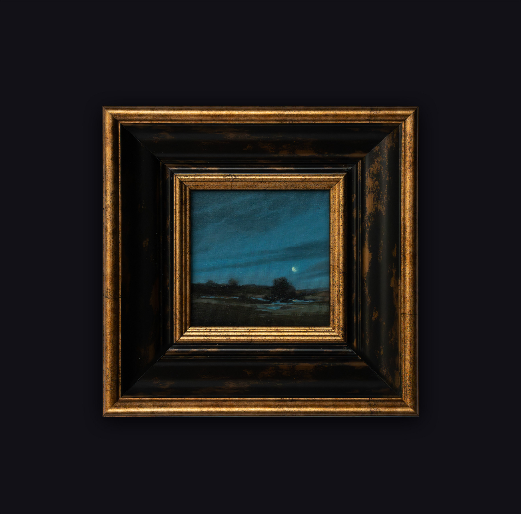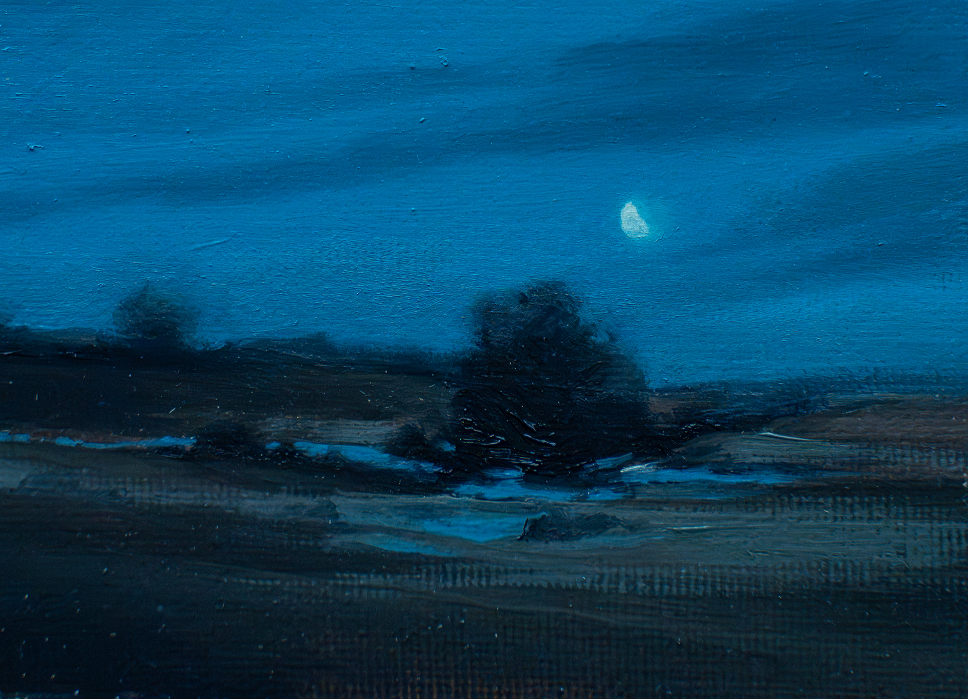 (oil on panel, 12.5 x 12.5cm, synthetic frame) 175€ - The meadows are not quite green yet, but full of mud and nightingale song, under the hazy spring night sky.