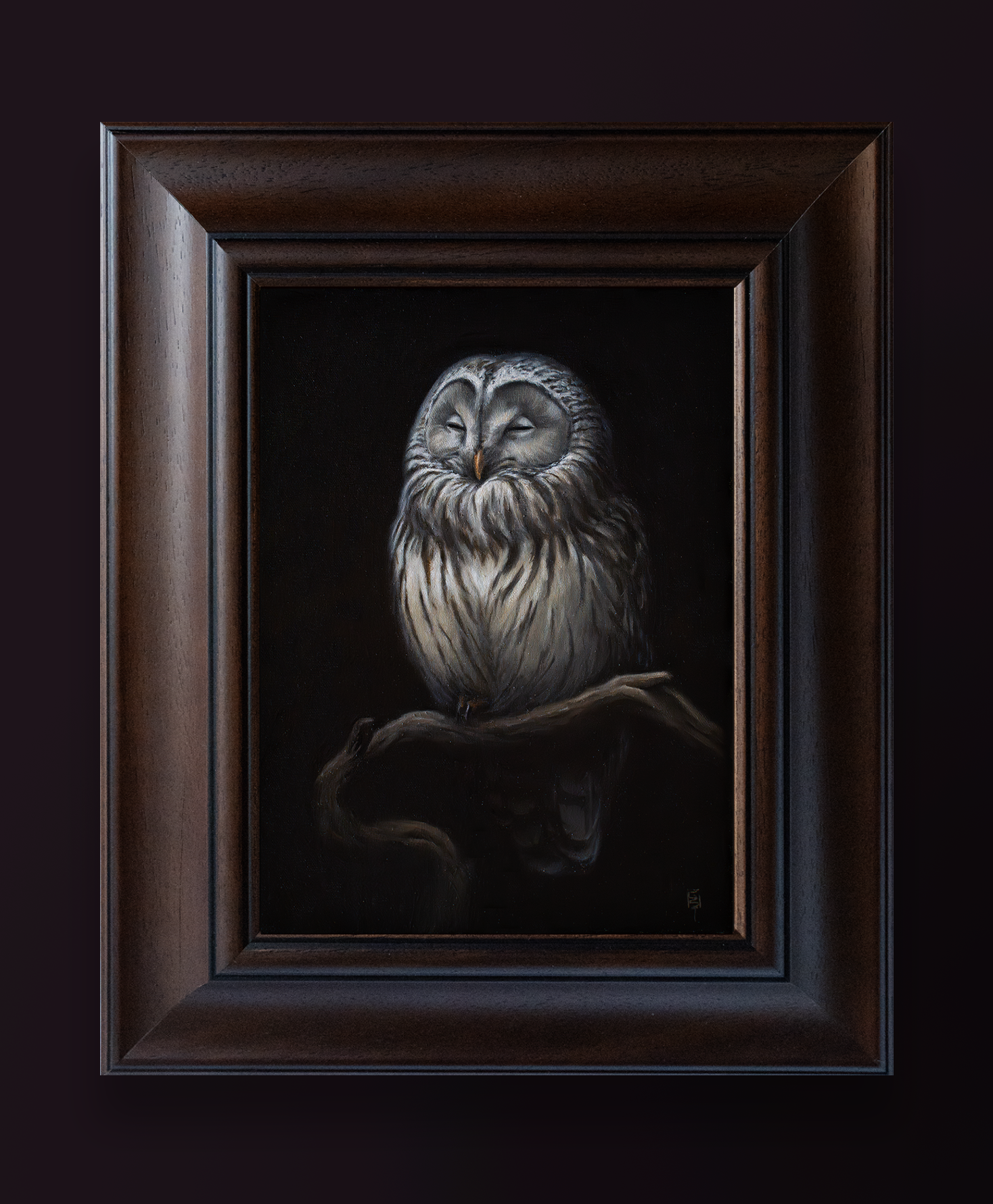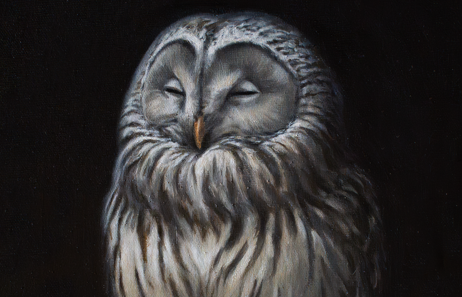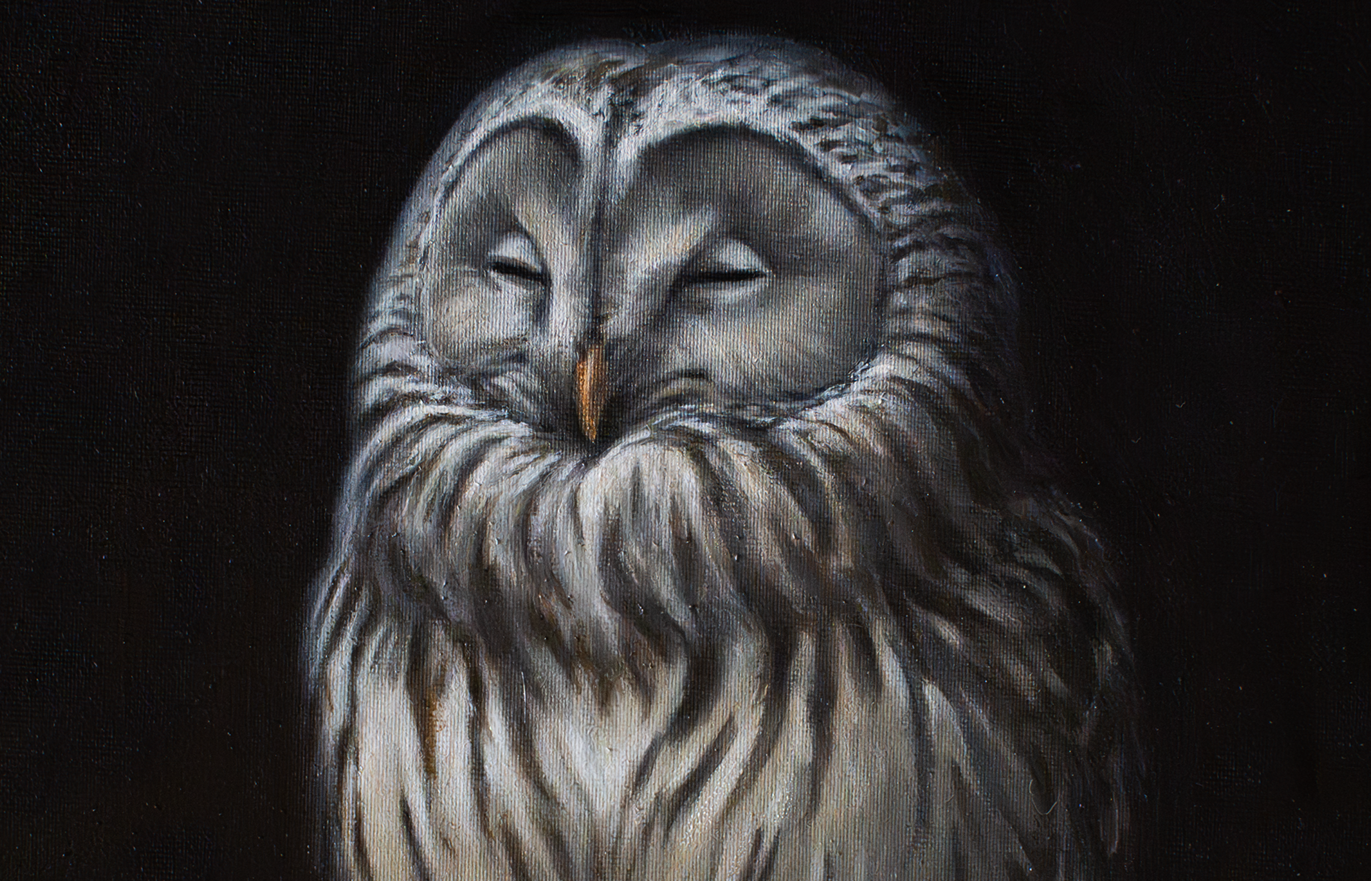 (oil on canvas, 18x24cm, wooden frame) SOLD - The Ural owl (Strix uralensis) is a quiet giant of northern forests, pale and watchful, with dark eyes that seem to hold the depth of old woods. Gliding soundlessly between towering trees, it rules its territory with patience rather than haste, hunting under moonlight and snowfall alike. We've met many times in the beech forest near my hometown and painting it was like painting an old friend's portrait.