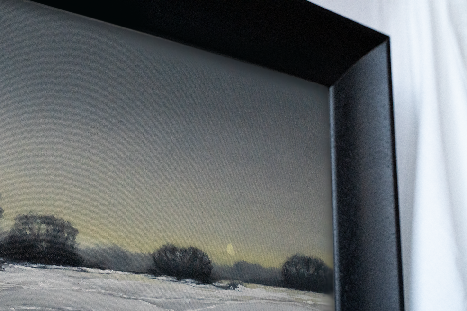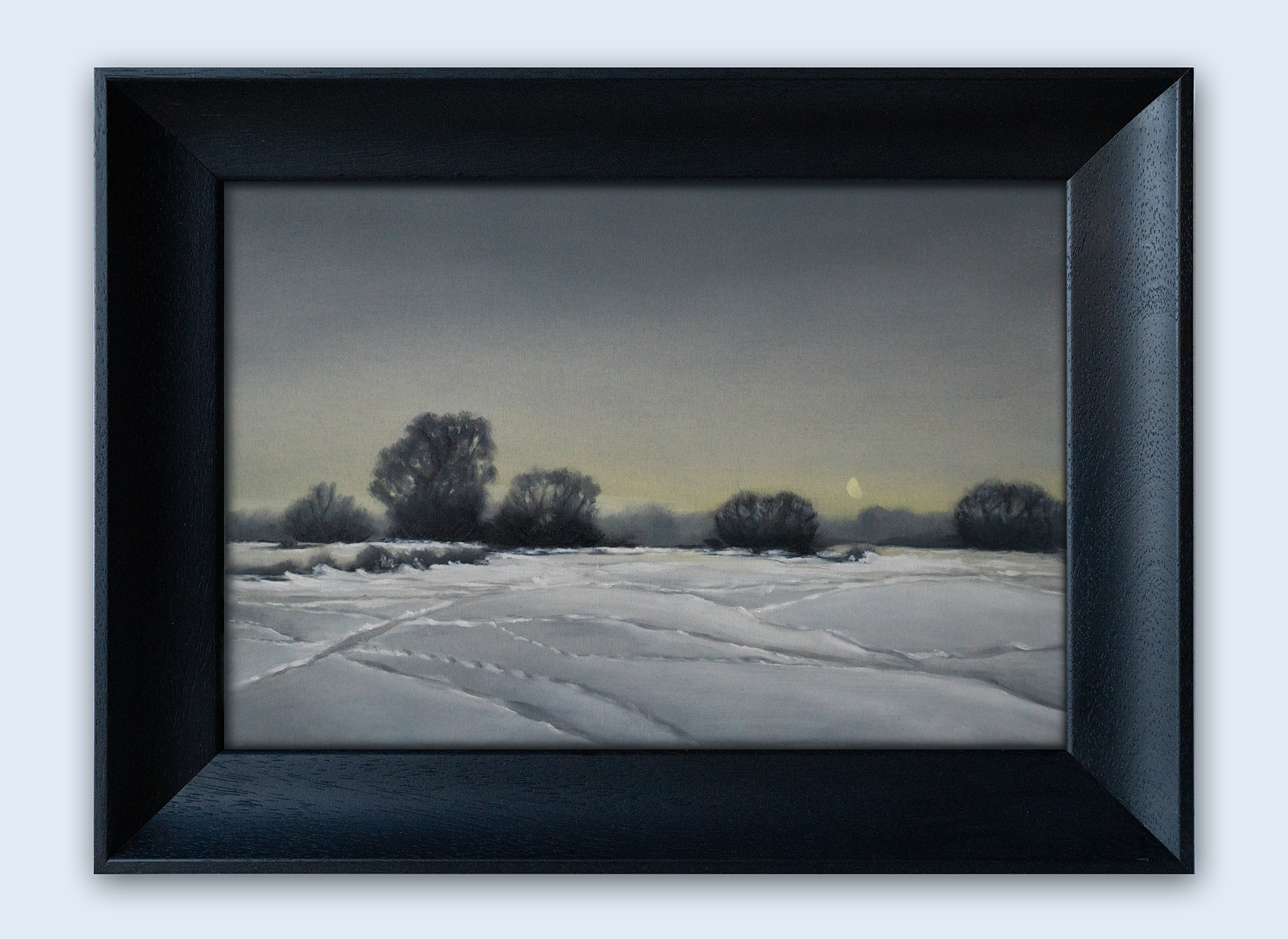 (oil on canvas, 24x34cm, wooden frame) 400€. Out in the distance, a crepuscular Moon shines through the hazy winter atmosphere over the snowy meadow near my home.